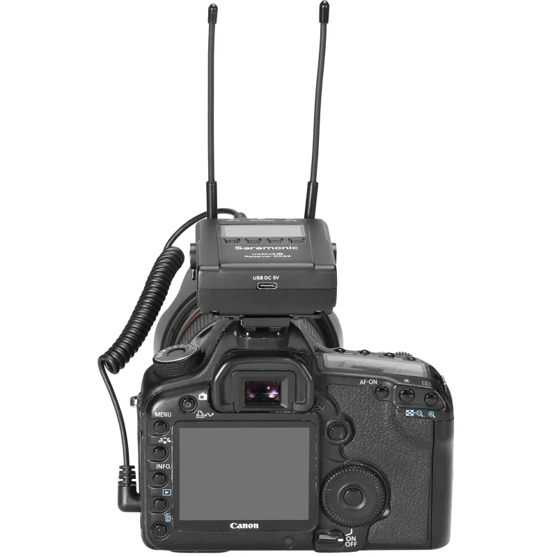 Saramonic UwMic9s RX ir kamerā uzstādāms divu kanālu UHF bezvadu uztvērējs. Tam ir plašs komutācijas RF joslas platums, augsta kontrasta OLED displejs un infrasarkanais starojums, sinhronizācija starp raidītāju un uztvērēju. Abas noņemamās antenas var pagriezt par 360° labākai uztveršanai. Uztvērēja izvadi var pārslēgt starp mono un stereo režīmu. Zemās frekvences funkcija uztvērējā samazina zemas frekvences dārdoņu.