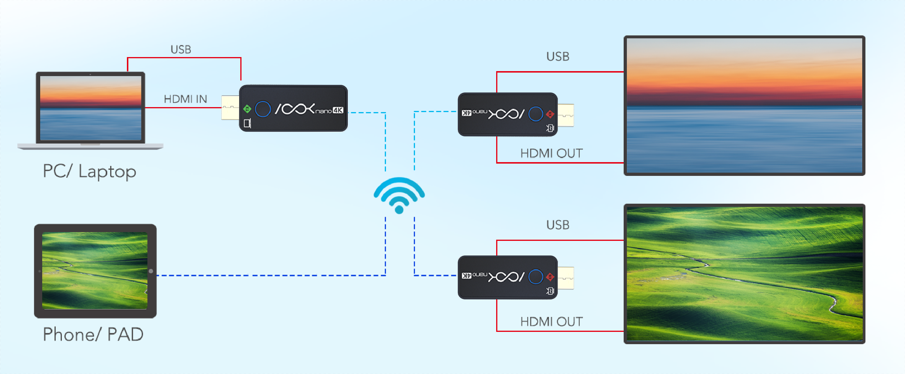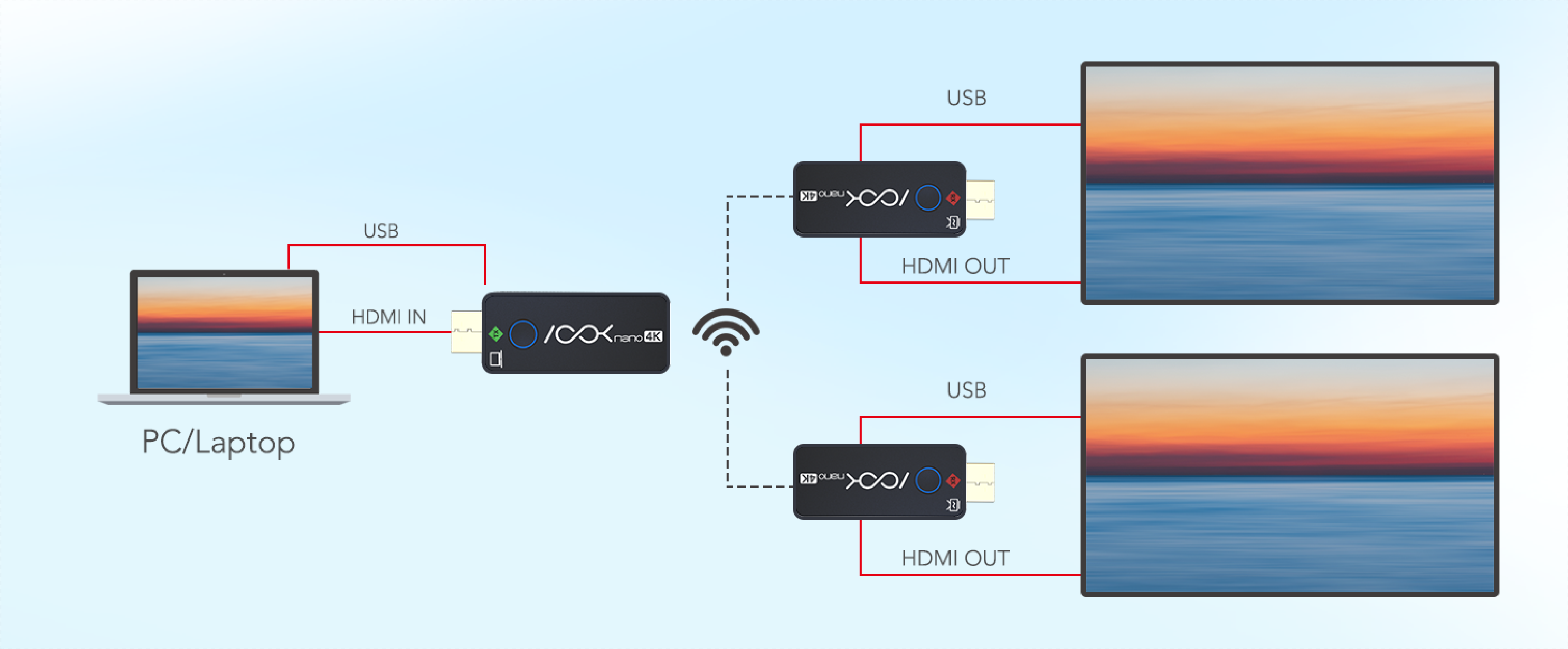 Standarta ASK nano 4K sastāv no viena raidītāja un diviem uztvērējiem. Uztvērējs ir savienots ar projektoru vai displeju, kamēr raidītājs savienojas ar datoru vai jebkuru ierīci ar HDMI ligzdu. Pēc savienojuma izveides lietotāji vienkārši gaida, kamēr ekrāns automātiski tiek straumēts uz displeju.