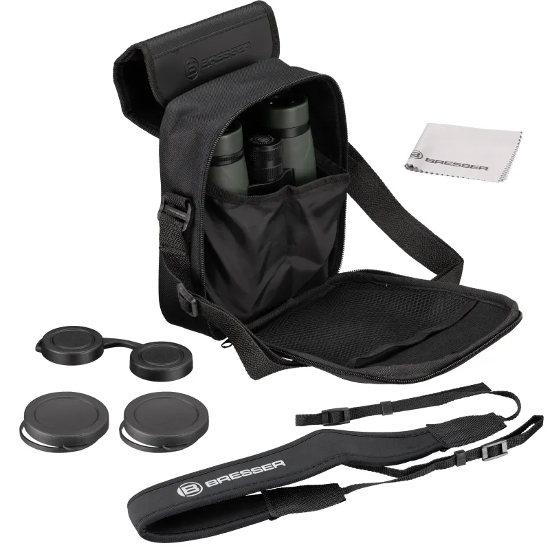 With the BRESSER Pirsch 15x56 binoculars , you always have the equipment you need for hunting and observations at dusk. The large lens diameter of 56 mm collects ample light for bright imaging, even in poor lighting conditions. With the high 15x magnification , we recommend that you use a tripod (not included), which can be mounted quickly with the integrated tripod connection thread . To ensure that glasses wearers can comfortably view the complete field of vision of 72 m at a distance of 1,000 m , the binoculars come with Twist-up eyecups . These can be adjusted in fours steps to ensure the right distance between the eyepiece lenses and the eyes. With the dioptre compensation of +/- 4 , you can also correct the difference in the visual acuity between your eyes. With rubber armouring , the binoculars will sit firmly in the hands and be protected in case of impact. Plus there’s also a padded strap for maximum comfort while en route to the next hide or observation site.