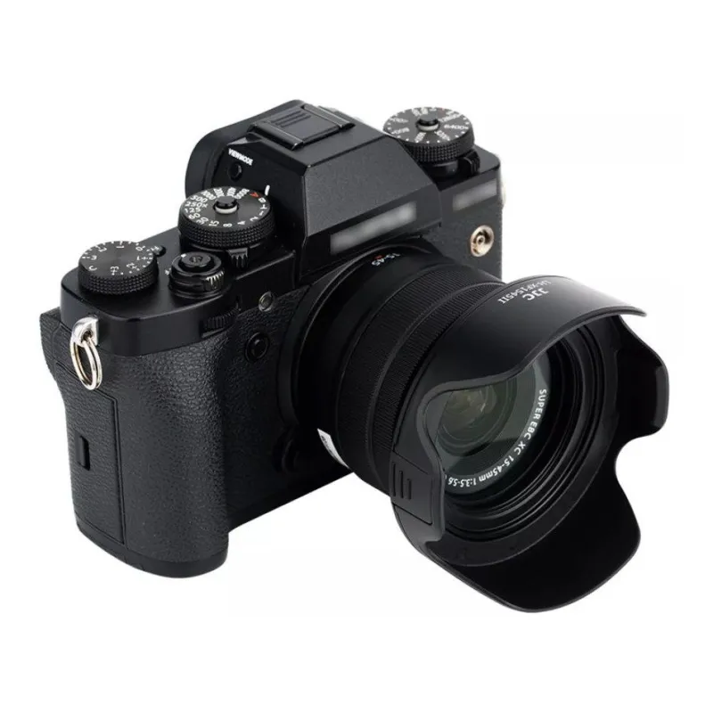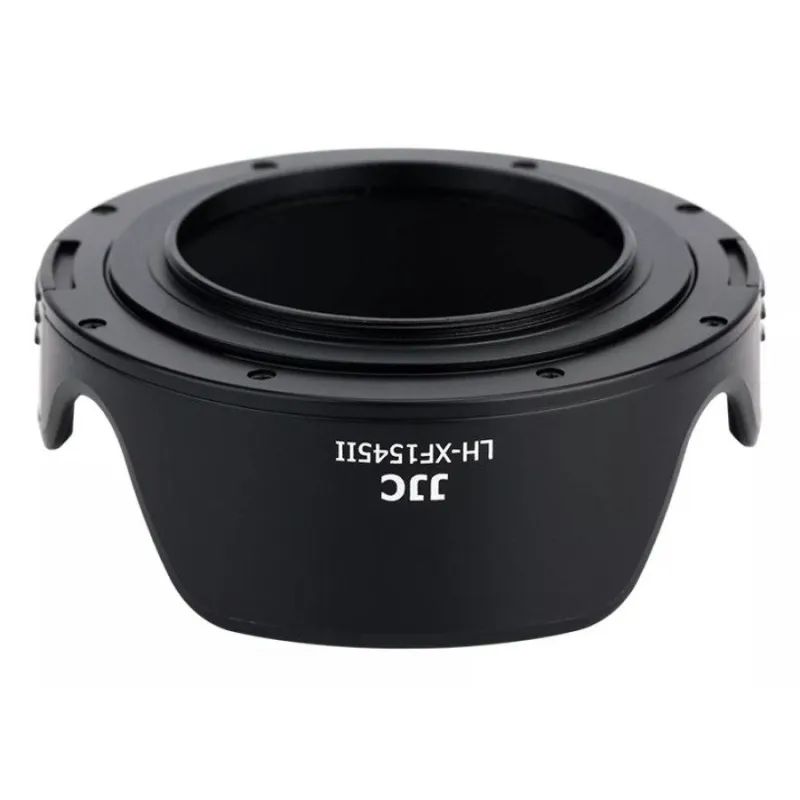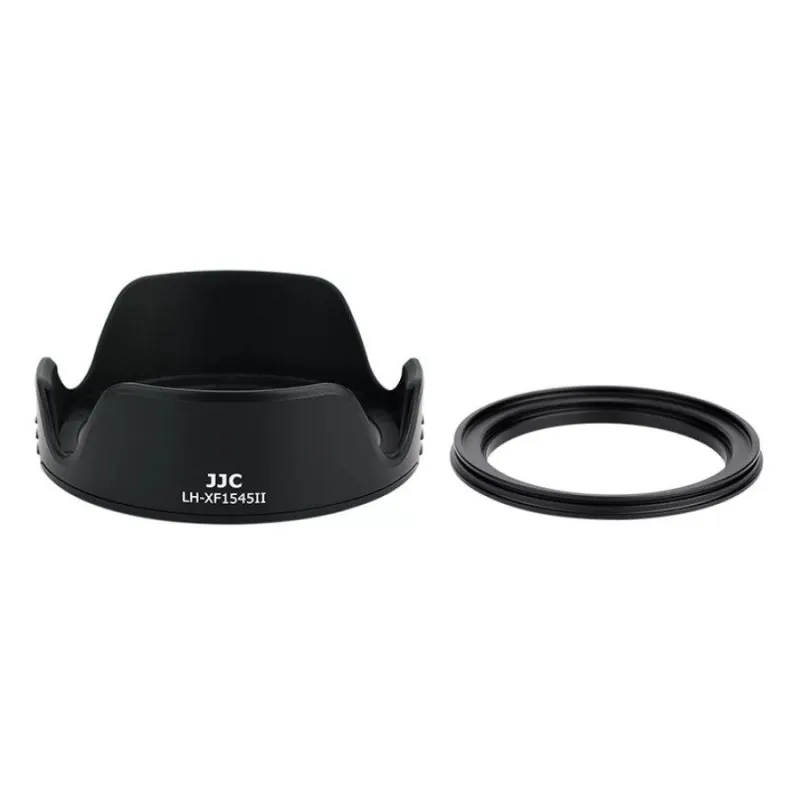 The JJC LH-XF1545II Sun hood is designed for the Fujifilm XC 15-45mm f/3.5-5.6 and XF 18mm f/2.0 lenses. With the sun canopy you simply use 52mm filters or lens caps on the lens. The sun hood protects against incident light and the matte finish counteracts reflections.