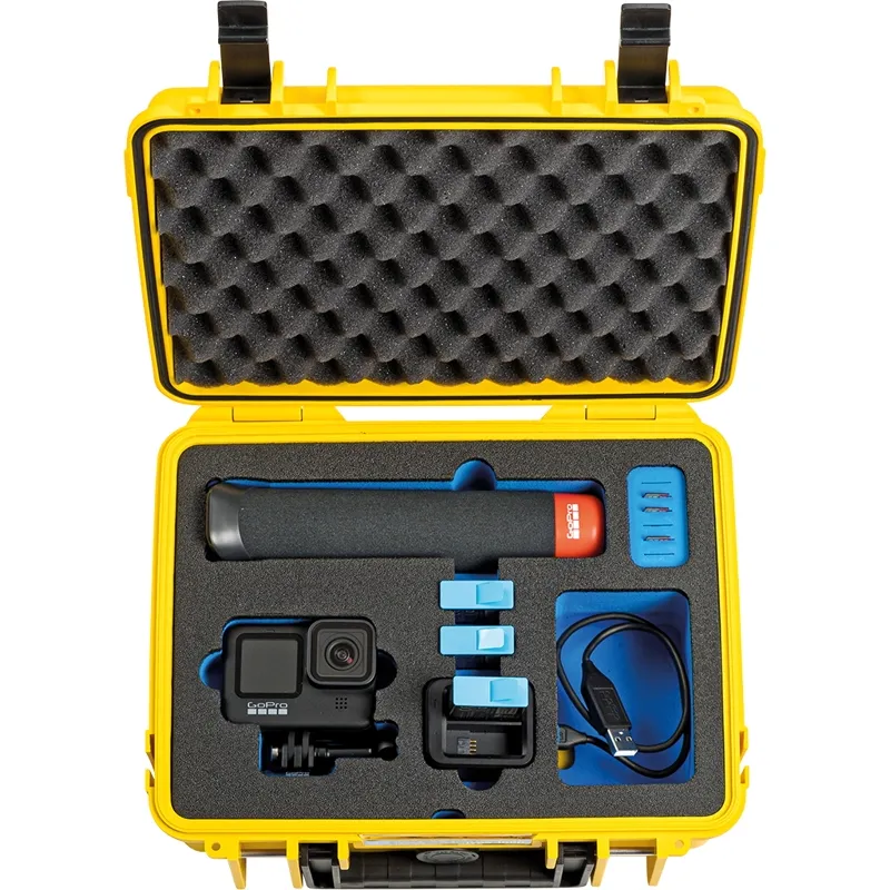 THE case for your GoPro Hero 9 Actioncam + accessories! Thanks to its custom foam insert it provides sufficient space for your GoPro Hero 9 and the accessories: the dual battery charger, up to 3 batteries, floating hand grip, up to 7 microSD memory cards, mounting brackets and cables. The spares compartment (92 x 62 x 57 mm) offers space for additional accessories and it is possible to charge two batteries directly in the case. An additional spares compartment (218 x 139 x 59 mm) in the second layer offers space for additional accessories, e.g. holders or tripod