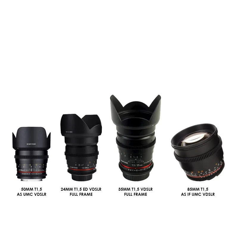 The lenses operate in manual aperture system with a low T number which enables natural shooting under various light exposure circumstances. All Samyang VDSLR lenses have the same color balance and location of gearing teeth to provide consistency and ease of swapping when used as a system.