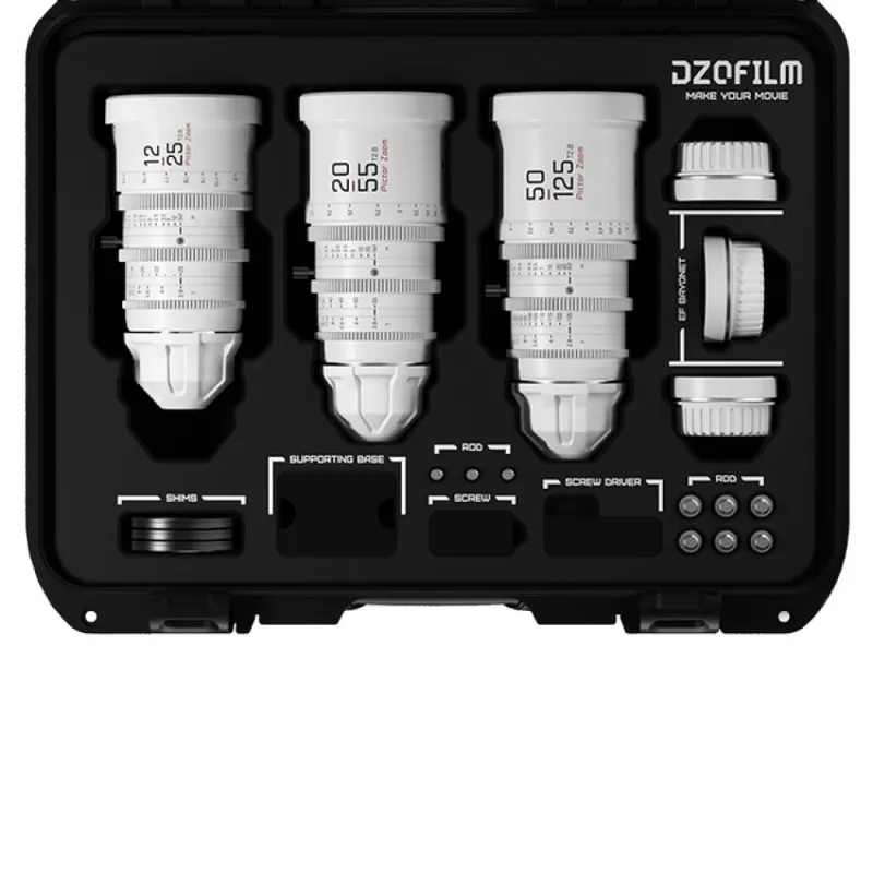 Šis komplekts ietver trīs DZOFILM Pictor Zoom objektīvus: 12-25mm, 20-55mm un 50-125mm, visi ar T2.8 diafragmu, kas ievietoti aizsargājošā somā.