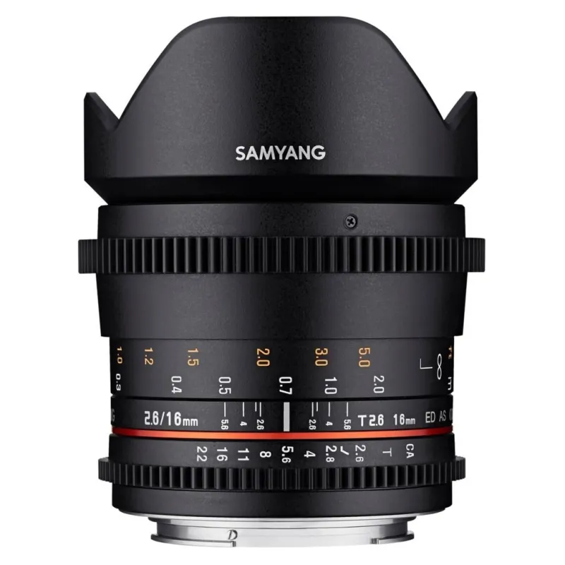 Ultra Samyang lens 16mm t2.2 VDSLR ED AS UMC CS designed for digital SLR cameras with APS-C. VDSLR Series is equipped with a rack that work with Follow Focus system. This results in smooth and precise rotation of the focus ring and aperture. Additionally, an aperture ring is rotated smoothly and silently. With these modifications can be extremely convenient and efficient handling of depth and & nbsp, the plane of focus during shooting.