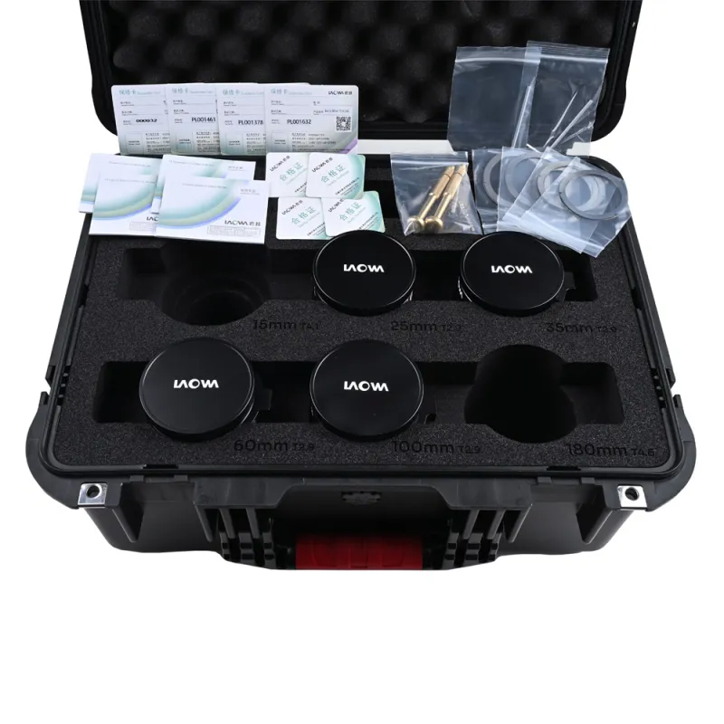Laowa Sword Cine 4 Lens Bundle (25mm, 35mm, 60mm, 100mm) Arri PL ir četru pilna kadra makro kino objektīvu komplekts ar fokusa garumiem 25mm, 35mm, 60mm un 100mm, kas paredzēts lietošanai ar ARRI PL montāžas kamerām.