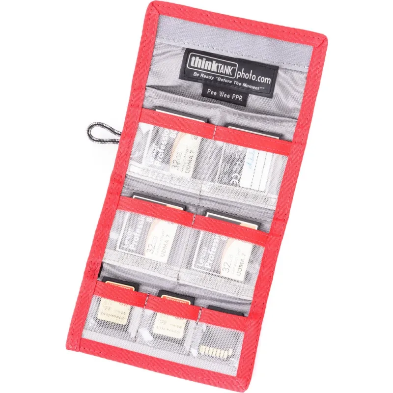 The Think Tank Pee Wee Pixel Pocket Rocket Memory Card Carrier is a handy, compact pouch that houses 4 CF and 3 SD cards. It's also a great business card holder. Small enough to fit easily into your pocket and attachable to clothing, belts and other Think Tank products--such as bags--the Rocket is a convenient and portable accessory for all photographers, pros and enthusiasts alike. It has a touch fastener closure and folds up wallet-style. The bright red color makes the pouch readily identifiable and hard to miss. The Pee Wee Pixel Pocket Rocket is durable, made of 420D Diamond Rip-Stop and 210D Antron Nylon. It is backed by a lifetime warranty.