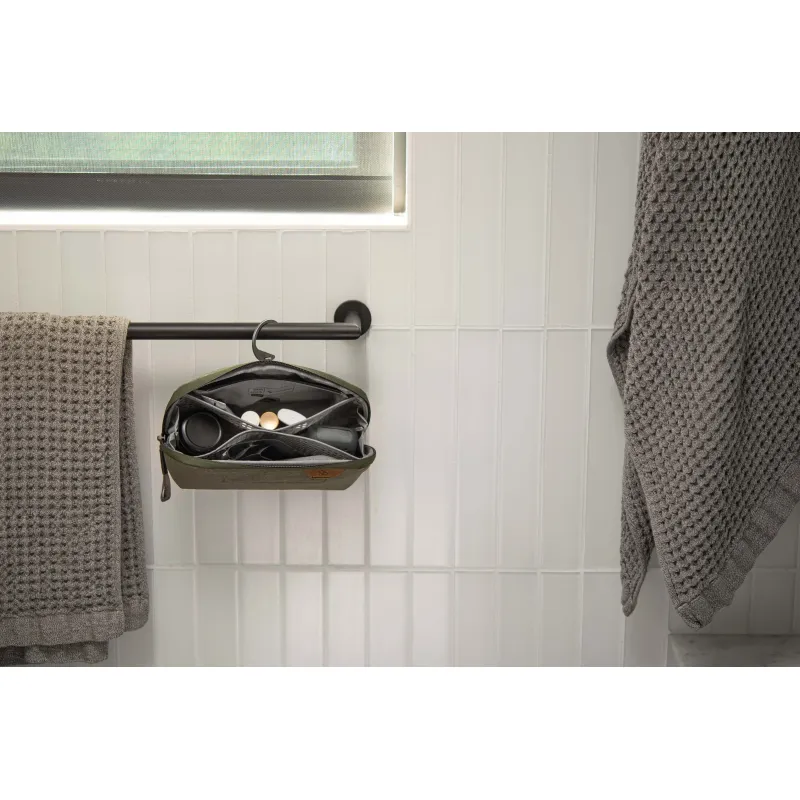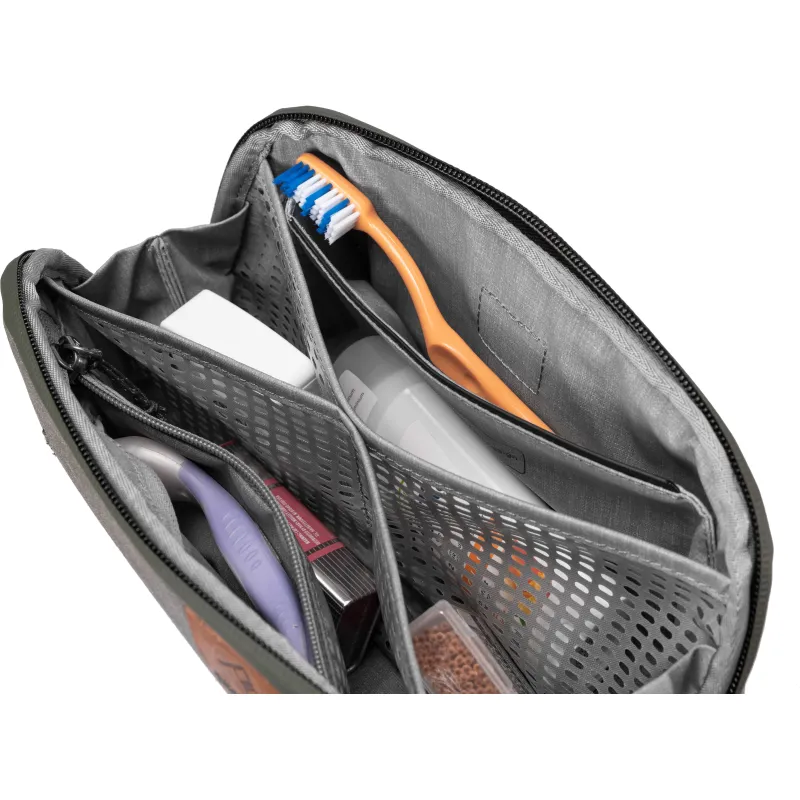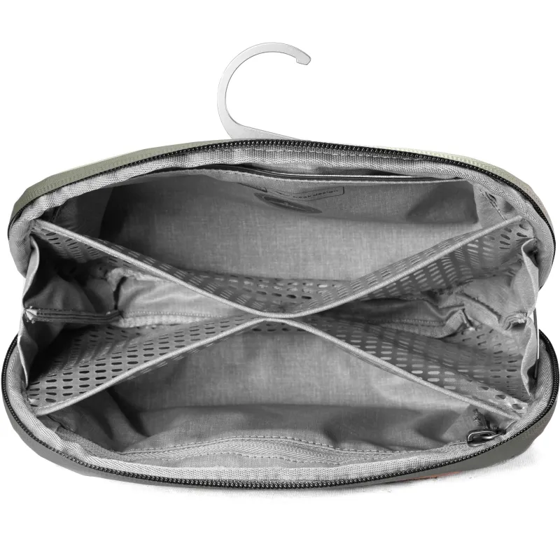 Izturīgi, pret laikapstākļiem izturīgi un viegli tīrāmi materiāli atgrūž ūdeni un traipus, tāpēc maciņš var izturēt lielu slodzi un vēl gadiem ilgi izskatīsies mirdzoši tīrs. Spēcīgais #8 laikapstākļiem izturīgais UltraZip ļauj somai plaši atvērties, nodrošinot pilnīgu redzamību un piekļuvi jūsu mantām. UltraZip var izturēt gadu desmitus, pateicoties patentētajam nodilumizturīgajam pavedienam. Maisiņš var novietot vertikāli uz letes vai piekarināt, izmantojot alumīnija āķi, ko var novietot. 4 iekšējās ar TPU pārklāta neilona tīklveida kabatas, iekšējā rāvējslēdzēja kabata un magnētiski aizzīmogota zobu birstes kabata nodrošina priekšmetu organizētību un tīrību. Turklāt visas kabatas var apgriezt uz otru pusi, lai tās varētu dziļi iztīrīt izlijušu šķidrumu gadījumā.