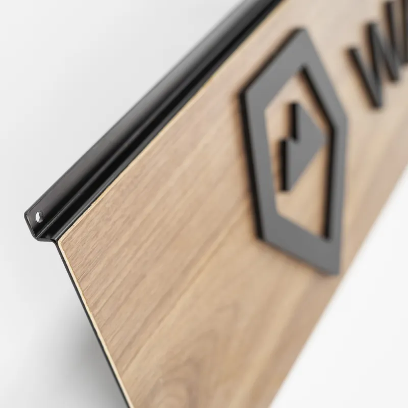 WANDRD logotipa zīme dabīgā koka fons ar melniem uzrakstiem