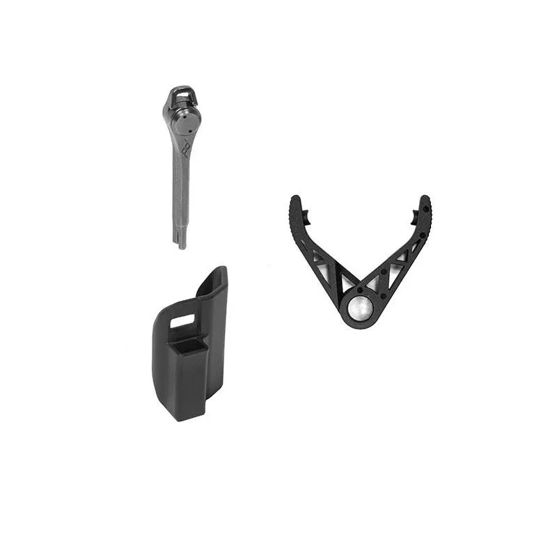 Komplektā ietilpst salokāmā sešstūra atslēga, salokāmā sešstūra atslēga kāju skava un bukses noņemšanas rīks - visi instrumenti, kas nepieciešami, lai regulētu un uzturētu jūsu statīvu.