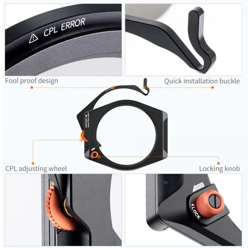 • * 【Original Design-Super-Diameter & Ultra-Slim 】K&F Concept Pro Square Filter System won the iF DESIGN AWARD and Red Dot Design Award. K&F Concept Unique Square Filter System, easy to take, no light leakage; The rear 95MM CPL perfectly solves the problem of filter stacking and removal. After removing the CPL, the cover can be closed to prevent light leakage.