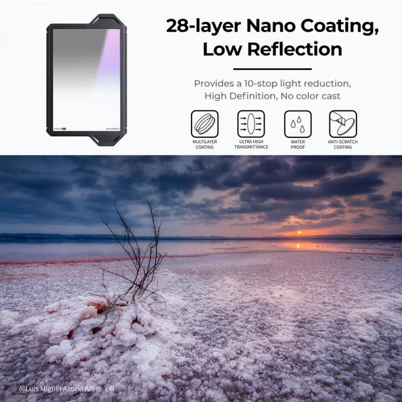 Īpaši plāns super diametrs: turētāja biezums 12 mm, 91 mm liela caurspīdīga apertūra. Efektīvi samazina vinjetēšanas iespējamību, ja tiek izmantots īpaši platleņķa objektīvs. Viegli noņemt, nav gaismas noplūdes: vienā turētājā var salikt divus kvadrātveida filtrus, un CPL tiks pacelts, kad tiks pacelts filtra turētāja vāks.