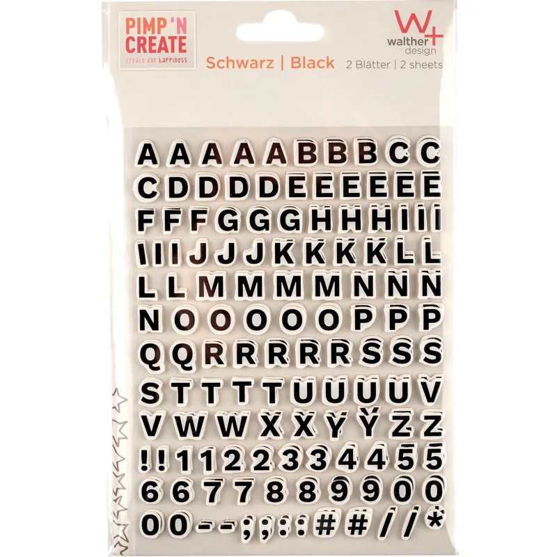 Self-adhesive letters in 3D and a thickness of 1mm. Size of letter is 1 cm. Paper base white with gold foil or paper base white with black foil. 2 sheets per polybag with 126 letters, numbers and special characters. The stickers are easy to apply and are characterized by a strong, permanent adhesive force, particularly suitable for paper / cardboard. Colors: gold or black Packaging: in a polybag