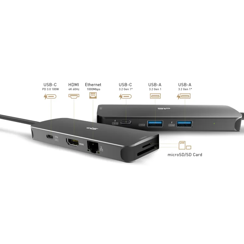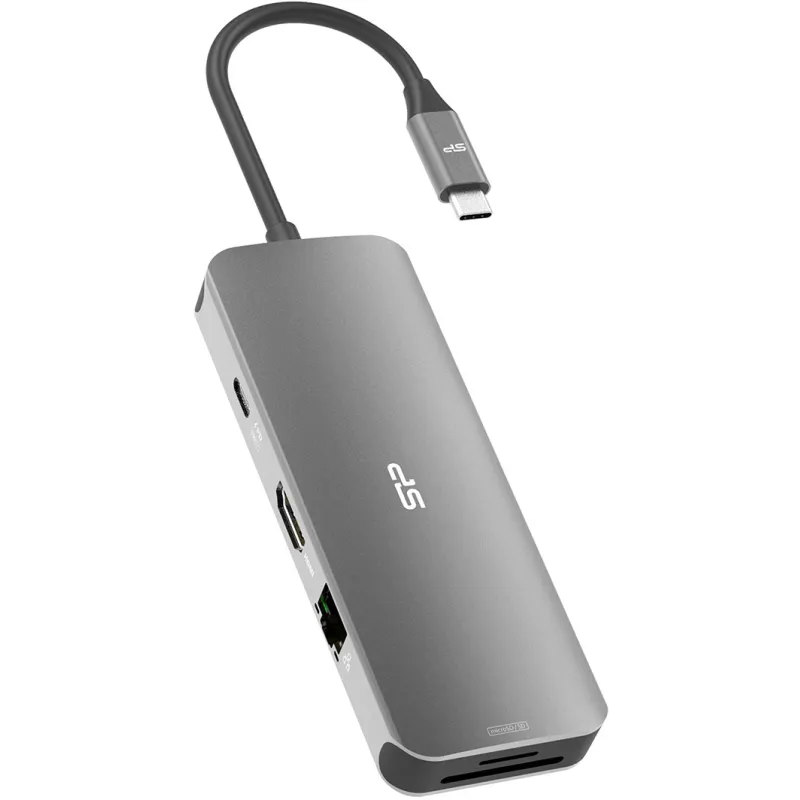 Kompakts un efektīvs risinājums Iepazīstieties ar Silicon Power dock SR30 8in1 - savienojamības jauda un ideāls risinājums jūsu USB-C ierīču savienošanai. Tā kompaktais dizains padara to ideāli piemērotu lietošanai mājās, birojā vai ceļojot starp darba vietām. Vienkāršojiet savienojumus ar šo daudzfunkcionālo centru.