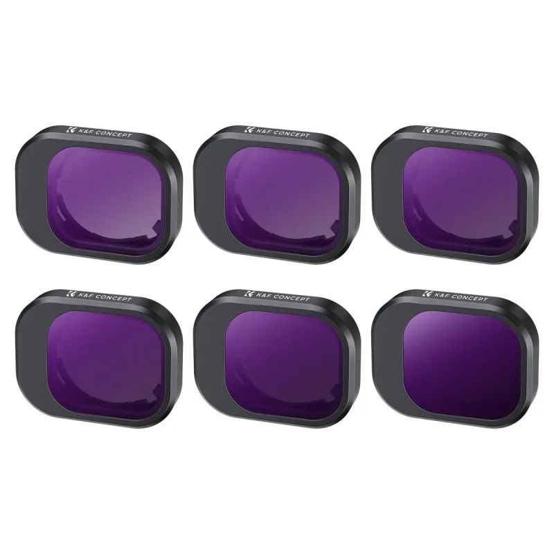 K&F Concept DJI Mini 4 Pro 6pcs filtra komplekts ir paredzēts DJI Mini 4 Pro, piedāvājot dažādus filtrus, lai uzlabotu jūsu attēlu un video kvalitāti dažādos apgaismojuma apstākļos. Filtri ir viegli uzstādāmi, viegli, un nodrošina augstas izšķirtspējas attēlus ar samazinātām atspulgu.