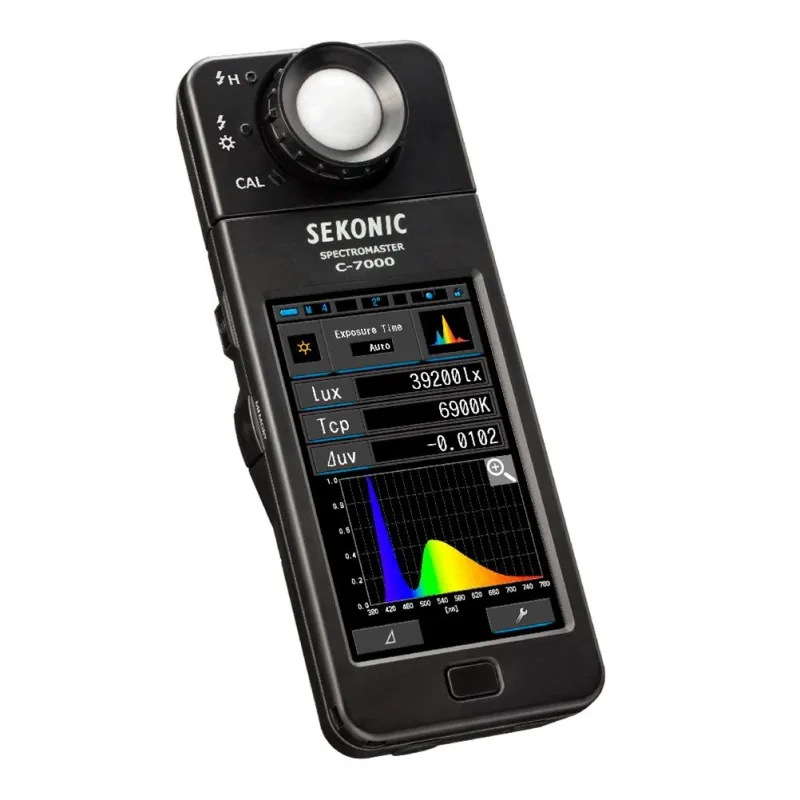 The SPECTROMASTER C-7000 is a portable handheld spectrometer, designed especially for industrial use. Utilizing Sekonic’s CMOS linear image sensor design and large touch-screen color display, the C-7000 can measure and accurately describe LED, HMI, fluorescent, as well as natural light and electronic flash. The C-7000’s Utility software (only Windows version available), displays memorized data in several ways and outputs spectral data in 1nm (nanometer) increments in CSV format. The C-7000 is an important measuring tool for quality control in lamp manufacturing, medical facilities, educational / office safety and health standards, agricultural lighting / design and many more industrial uses.