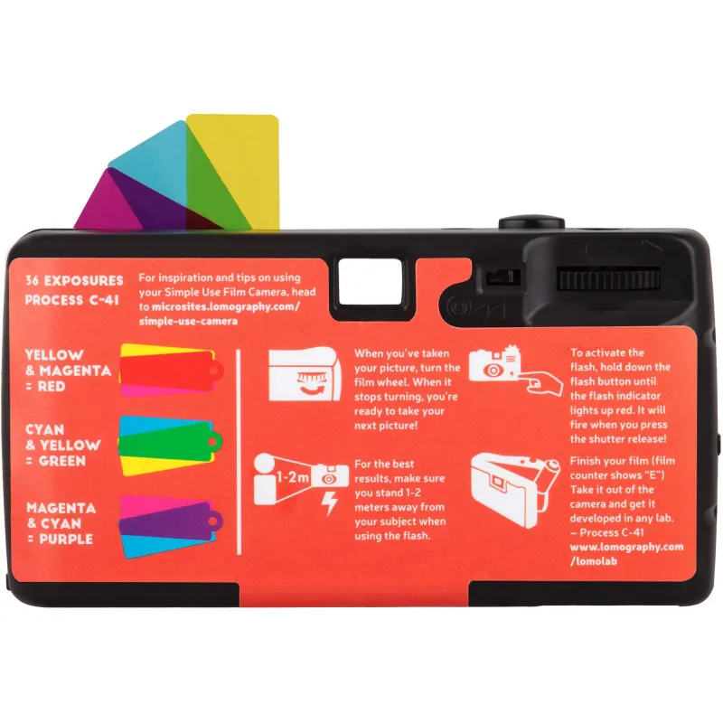 Lomography Color Negative 400 Vienkāršas lietošanas kinokamera Color Negative 400 ir unikāla, radoša un vienlaikus ļoti ērta kamera, kurā var atkārtoti ielādēt Lomography krāsu negatīvo 400 filmu. Šī vispārējas nozīmes, universālā filma ir piemērota lietošanai dažādos apgaismojuma apstākļos un nodrošina klasisku filmas raksturu. Fotoaparāts vēl vairāk papildina darbu ar šo filmu, jo tajā ir iebūvēta zibspuldze, kurai ir trīs šūpojoši želejas, lai radītu krāsainus zibspuldzes efektus. Vienkāršas lietošanas kamerai ir arī platleņķa 31 mm f/9 objektīvs ar fiksētu fokusa diapazonu no 3,3' līdz bezgalībai, fiksētu slēdža ātrumu 1/120 s un skaidru loga skatu meklētāju kadru izkārtošanai.