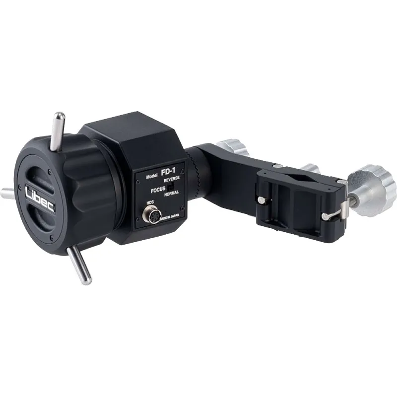Libec FD-1 is a studio-grade focus demand controller compatible with Canon and Fujinon lenses (connection cables are optional). The knob and three pegs offer great grip and operability. The focus ring's drag makes focusing easy and allows users to better concentrate on their shots. The Reverse switch allows users to change the focus rotating direction. For your comfort, the focus demand can be attached to a right or left pan handle and offers great operability. By adopting a unique design and using aluminum, the mounting clamp is rigid and super lightweight. In addition, it is easy to securely attach this to a pan handle.