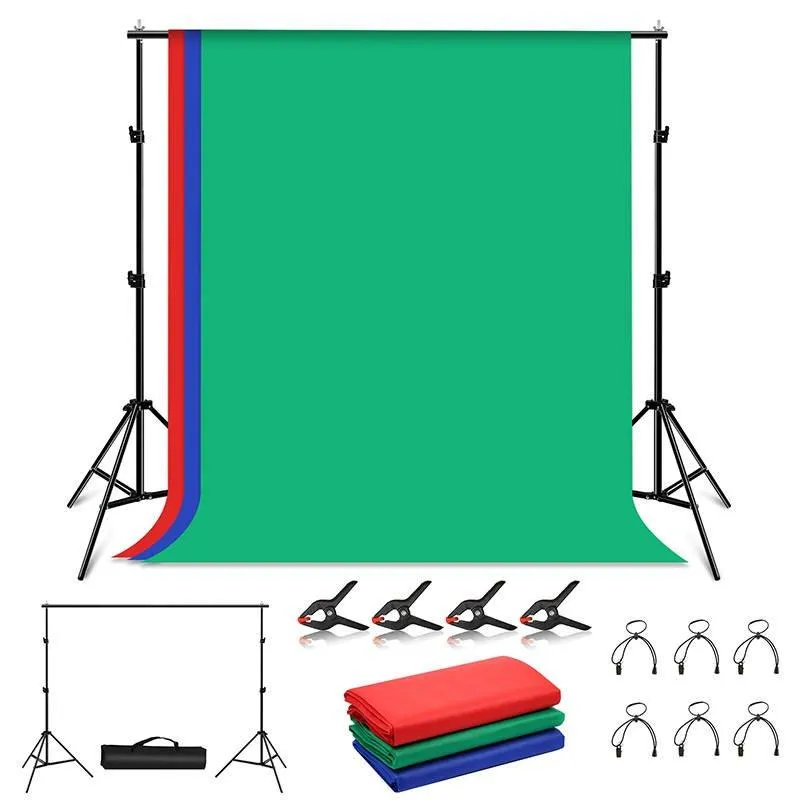 Šajā komplektā ir iekļauti 3 auduma foni zaļā, sarkanā un zilā krāsā, tāpēc ikviens atradīs kaut ko. Fonu izmēri ir 1,6 x 2m, kas palielina lietošanas brīvību. Atkarībā no jūsu vēlmēm varat izmantot fona kolāžas fotosesijām, video žurnālu ierakstīšanai utt.