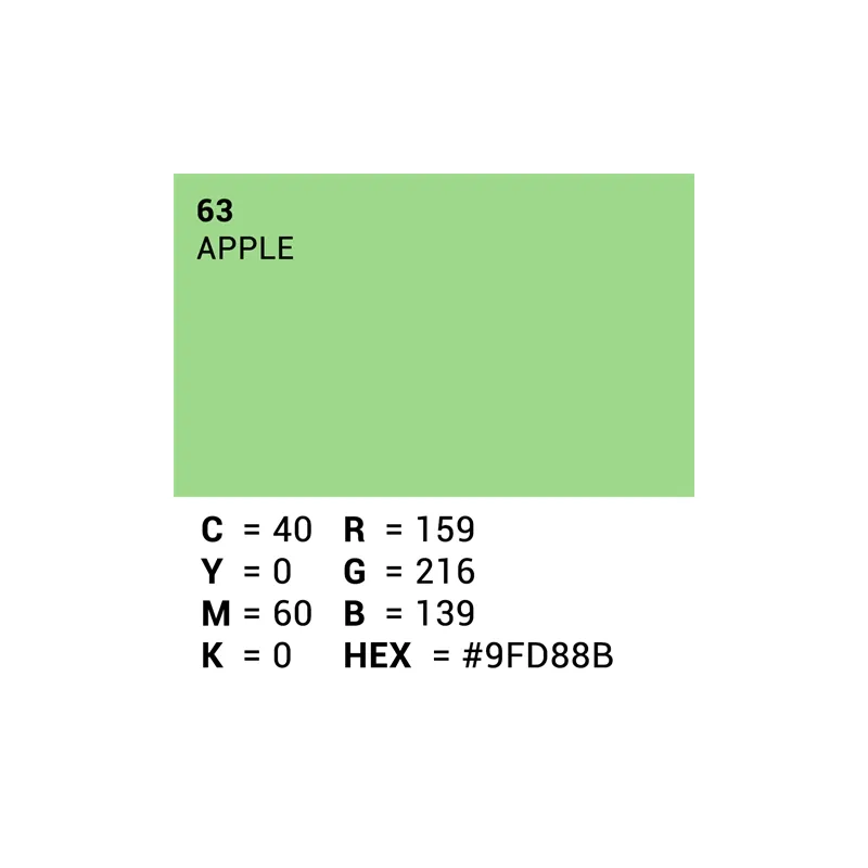 This roll of Superior Specialties backdrop paper is a 1.35 x 11m roll in the color 63. Apple, which is effectively apple green. With this roll of professional quality paper you can create a smooth, even background.