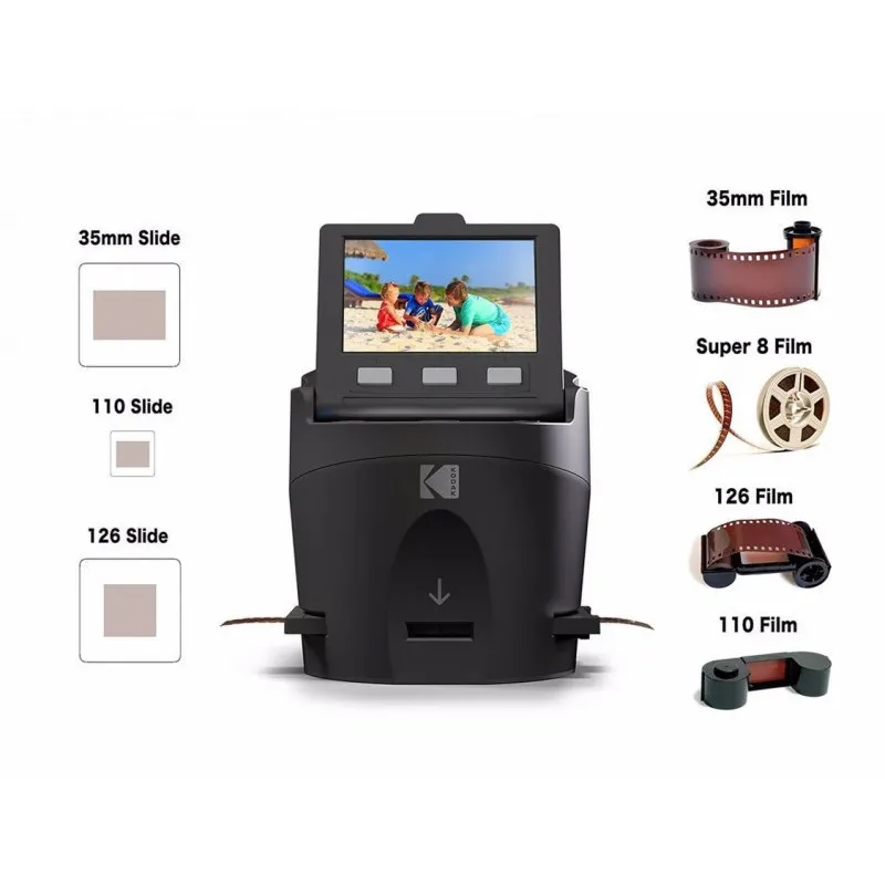 Izmantojot KODAK digitālo filmu skeneri, pagātnes izdzīvošana ir tikpat vienkārša kā skenēšana, saglabāšana un kopīgošana. Šis daudzpusīgais filmas-JPEG pārveidotājs digitalizē un optimizē dažādas filmas, tostarp 35 mm, 126, 110, Super 8 un 8 mm negatīvus, ļaujot pārsūtīt attēlus uz jebkuru Mac vai PC ierīci, lai tos saglabātu, koplietotu, drukātu un rediģētu. Mūsu viss vienā komplektā ir iekļauts viss nepieciešamais skenēšanas sākšanai: dažādi filmu adapteri un ieliktņi, iebūvēts LCD krāsu displejs, īpaši vienkāršs darbības interfeiss, kā arī vairāki kabeļi ierīces pievienošanai. Neapmierinieties ar zemāku attēla kvalitāti. Uzticieties digitālo inovāciju milzim.