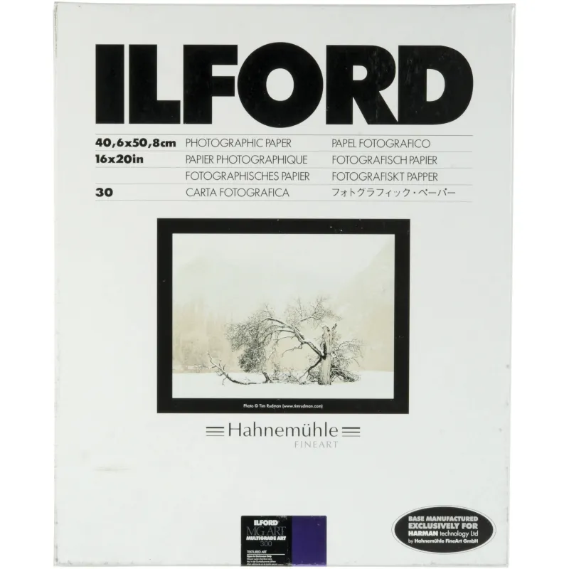ILFORD MULTIGRADE ART 300 has a textured matt surface with an eggshell sheen. The new base has been specially produced for HARMAN technology by Hahnemühle FineArt GmbH. The fine art base with a MULTIGRADE silver gelatine coating has a cool base colour and warm image tone. Compared to ILFORD FB (baryta) papers slightly shorter wash times are achieved, and the paper can easily be handled in large sheets thanks to its 300 GSM weight.