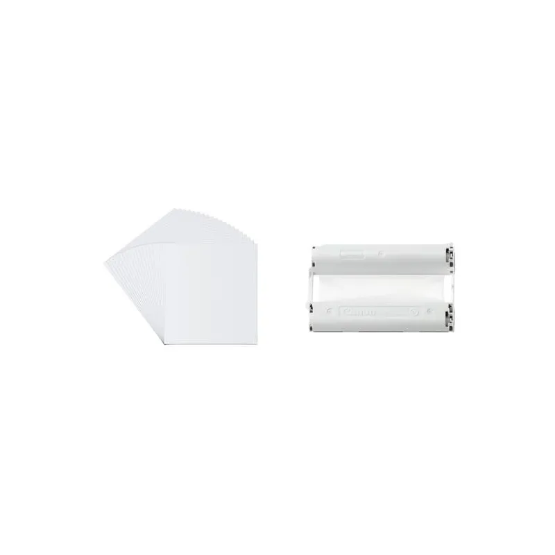 Canon Selphy Square Media Pack XS-20L consists of photo paper and ink. Both are for Canon Selphy Square QX10 printer. There are 20 sheets of 68 × 68 mm photo paper and they have a white border for writing.