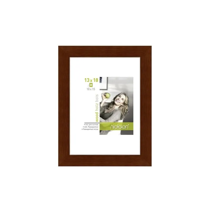 The 8988004 Apollon from Nielsen is a brown (Wenge) picture frame suitable for one picture. You can insert a picture of 13x18 cm in this frame. A passe-partout is also supplied for 10x15 cm pictures. The picture frame is characterized by its wooden look. The total dimensions, including the frame, are 17x22 cm.