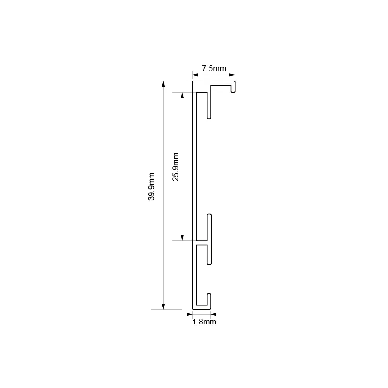 - Liels alumīnija priekšējais malas ar dziļu kastes profilu 7.5 mm platumā un 39.9 mm dziļumā