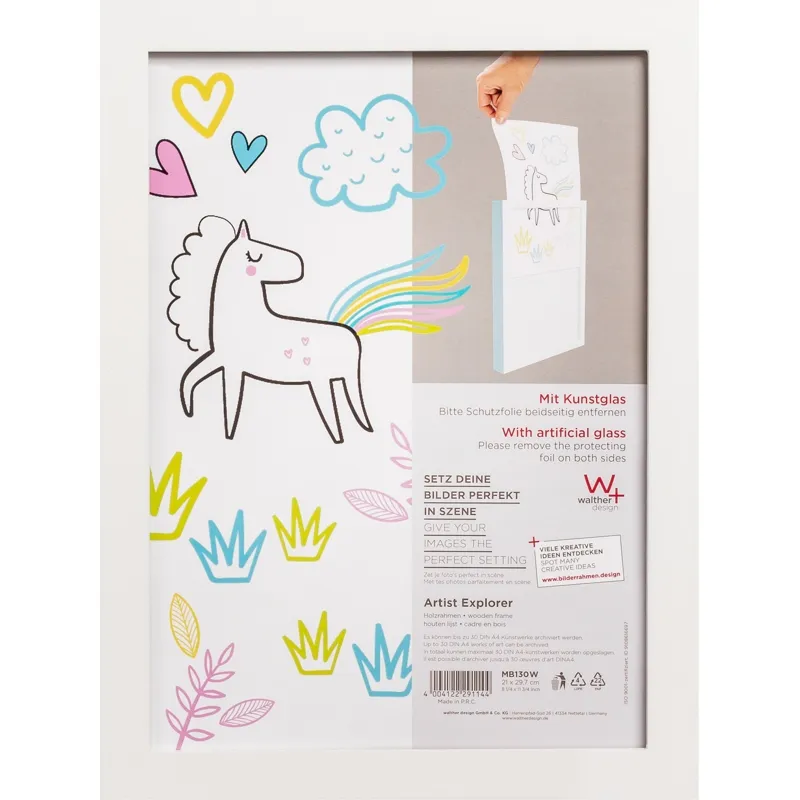This frame is m,ade for images in A4 size (21x29,7 cm). Perfect for childrens drawings. The frame is in white mDf and with plexi glass. You can both stand the frame and hang it on the wall horizontal or verical.