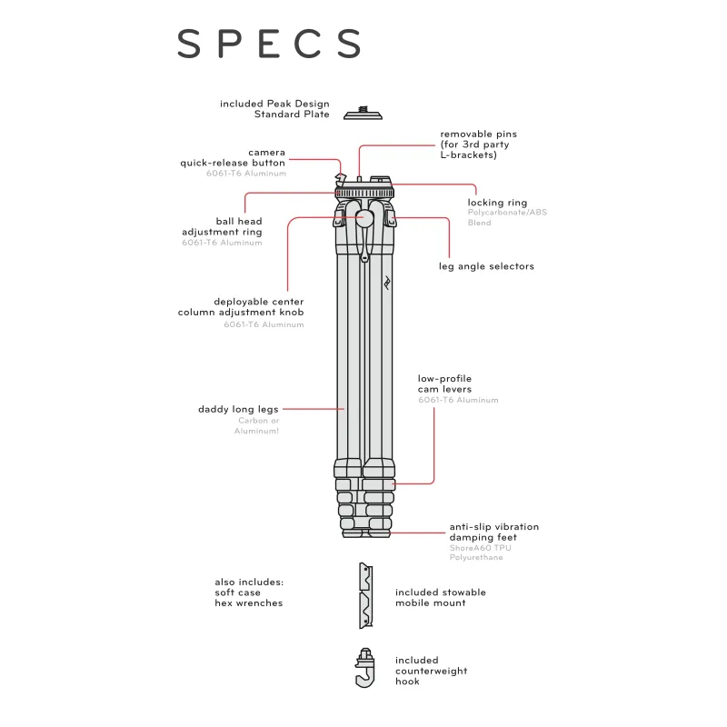 Statīvs ir mazs un ir radīts, lai to var ērti ņemt līdzi ceļā, taču smagumizurīgs - paredzēts lietošanai arī ar zoom lēcām. Statīvs ir ērts lietošanā, to ļoti ātri ir salikt kopā un izjaukt, statīva galva ir modificēta ērtai un ātrai lietošanai. Tas ir izturīgs un nodrošināts ar Peak Design mūža garantiju.