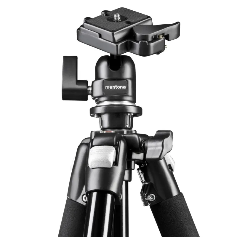 The mantona Scout is delivered including ball head and quick-release system. The camera plate is normed and can be used with all common tripods. The ball head allows quick reacting to changing light conditions. It can be turned in all directions without problems.