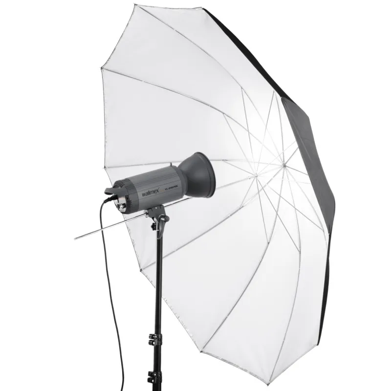 This umbrella by walimex is particularly convenient, as it is reflex umbrella and translucent umbrella at the same time. It consists of two layers, the outer reflex layer, which is coated silver on the inside and black on the outside, and the inner white translucent layer. In order to turn the umbrella from a reflex umbrella into a translucent umbrella, you can simply remove the outer layer.