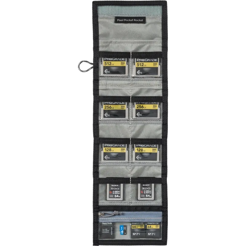 Ērts salokāms maksts 10 CFast vai CF Express B tipa atmiņas kartēm caurspīdīgos slotos, kā arī viens rāvējslēdzēja aizdares slots mazākiem, brīviem priekšmetiem, piemēram, micro SD kartēm. Viegli iekļaujas kabatā vai piestiprināms pie jostas vai somas.
