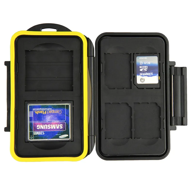 The JJC MC-SD/CF6 Multi-Card Case is a strong and splash-proof storage solution for 4 SD and 2 Compact Flash memory cards. The moulded rubber interior absorbs shocks and ensures the memory cards stay in position when you put the Multi-Card Case in your bag. It also protects your precious cards from dust and other debris. The ergonomic locking system is easy to open and close.
