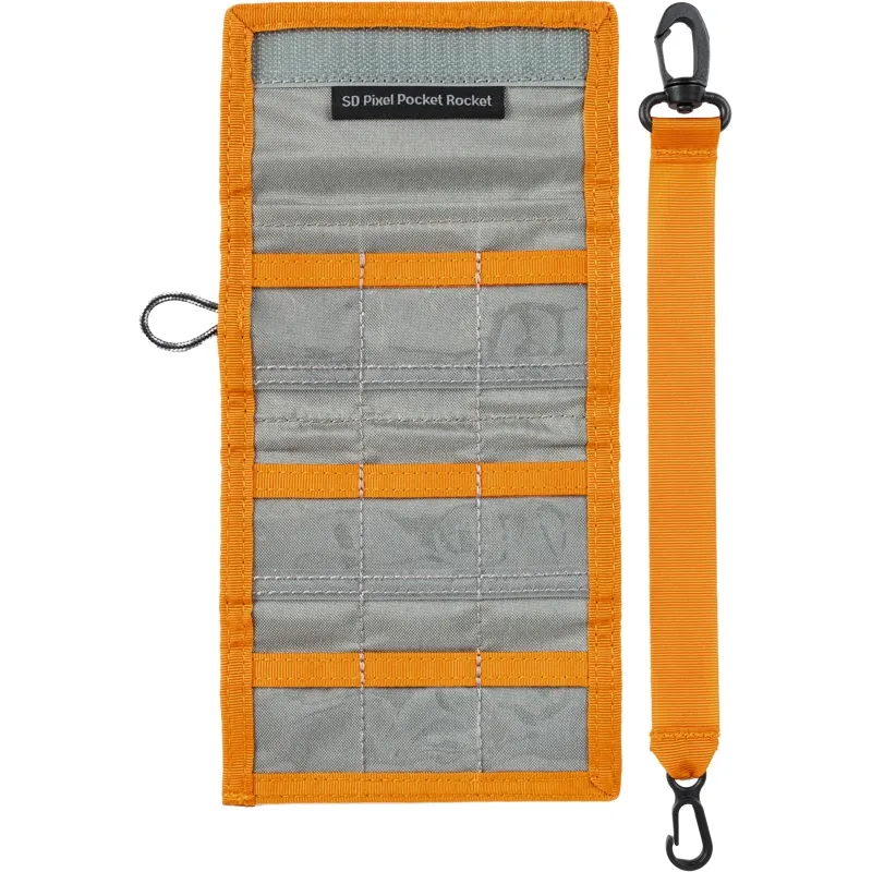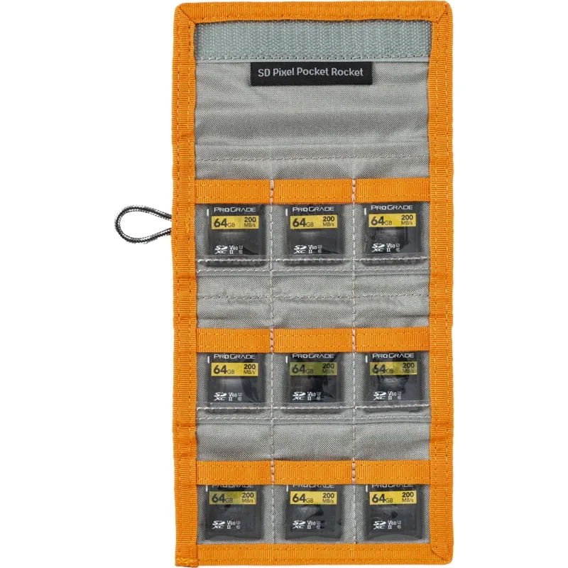 Ērts maksts 9 SD vai CFexpress A tipa atmiņas kartēm, kas viegli iekļaujas kabatā vai piestiprināms pie jostas vai somas.