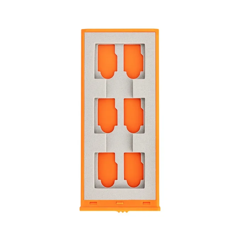 Izturīgais un izturīgais JJC MCK-CFA6GO atmiņas kartes korpuss nodrošina aizsardzību 12 micro SD atmiņas kartēm un 6 CFexpress Type-A kartēm. Divpusējais absorbējošs gumijas iekšpuse nodrošina, ka katra karte paliek droši savā vietā un to nevar sabojāt, piemēram, sitieni.