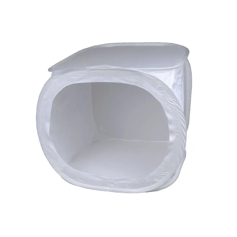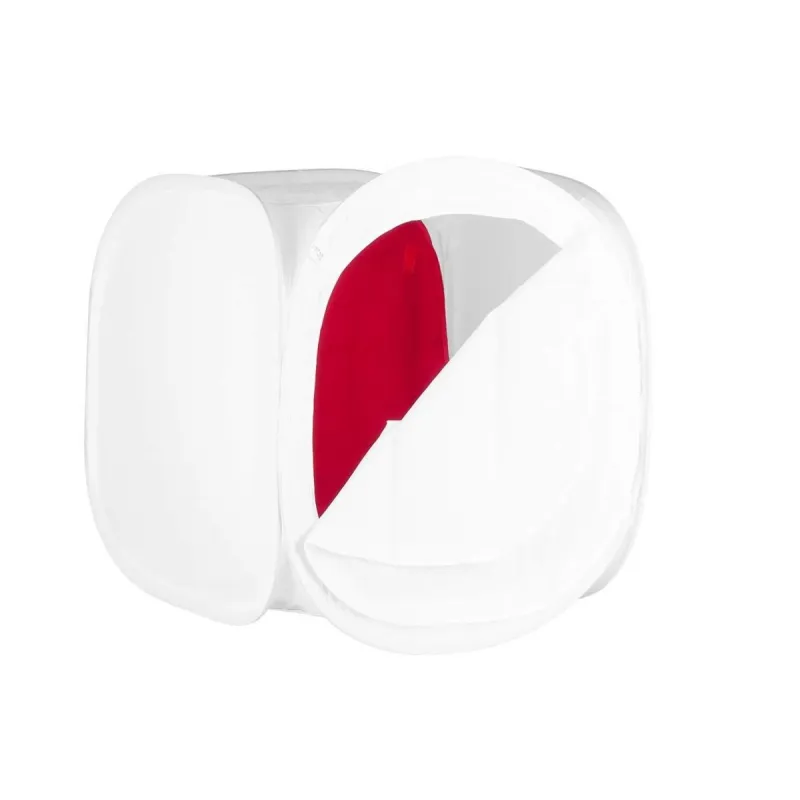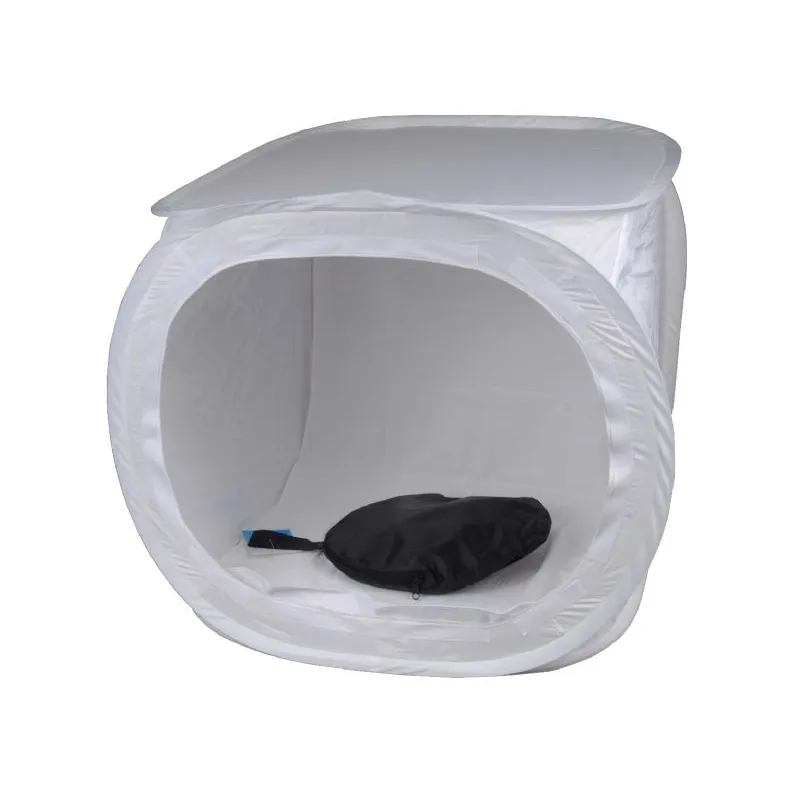 The Falcon Eyes light tents are especially designed for product photography of for instance products such as glass, synthetics, jewellery, watches, ceramics and electronics. The light tent is foldable and with the supplied case easy to take along on location. The diffuse material is very suitable for minimising disturbing reflections and spreads the light equally. The material of the light tent provides a neutral colour temperature. The front of the tent can be closed with the supplied cloth which can be fixed with Velcro. In the cloth is an opening for the lens of your camera. For an ideal lighting the box can be used in combination with normal daylight, continuous lamps or studio flash units.