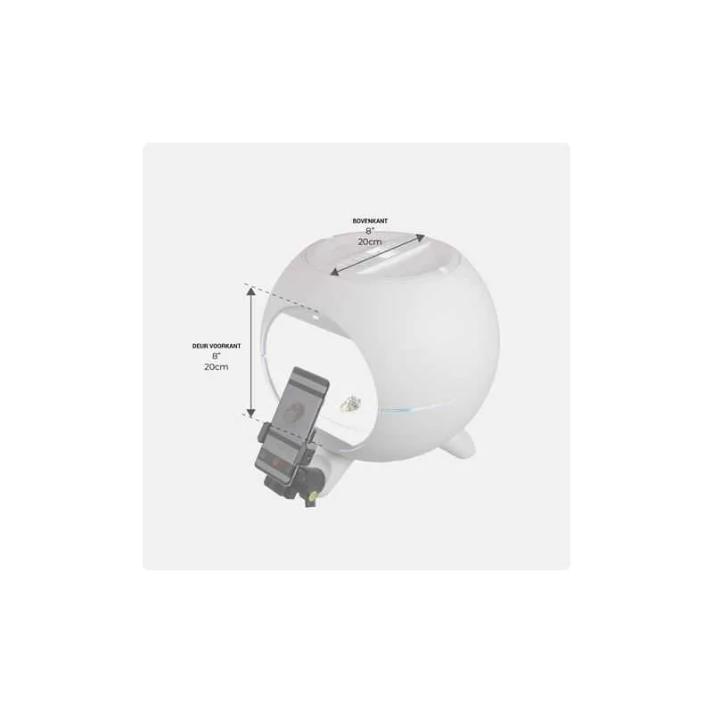 Gan Smart Dome priekšpusē, gan augšpusē ir atvere. Tādējādi ir iespējams ierakstīt gan produktus, kas novietoti plakaniski uz pagrieziena galda, caur augšpusi, gan izstrādājumus, kas stāv vertikāli, caur priekšpusi. Ir pieejams atsevišķs viedtālruņa turētājs (skatiet papildu piederumus), kas ļauj ērti uzņemt attēlus no pareizā leņķa. Augšpusē atradīsit divus elastīgus klipus, lai piestiprinātu (piemēram) ķēdi.