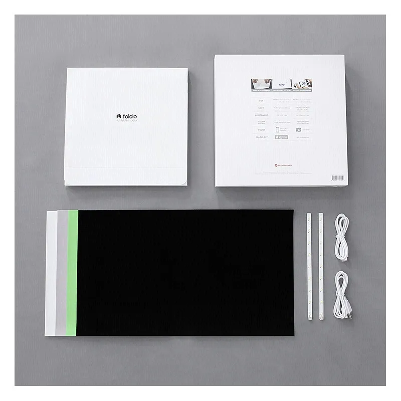 You can use the Foldio1 for taking photos and videos, with the built-in LED strips ensuring a uniform illumination. Four backgrounds are included, to create a good contrast with the product in every situation. You will receive the smooth, mat-foam background in the colors white, black, gray and chroma green. The backgrounds run seamlessly from the vertical side into the horizontal surface and can be exchanged within seconds with the built-in magnets. The use of the soft, non-reflective foam provides a uniform background without reflections.