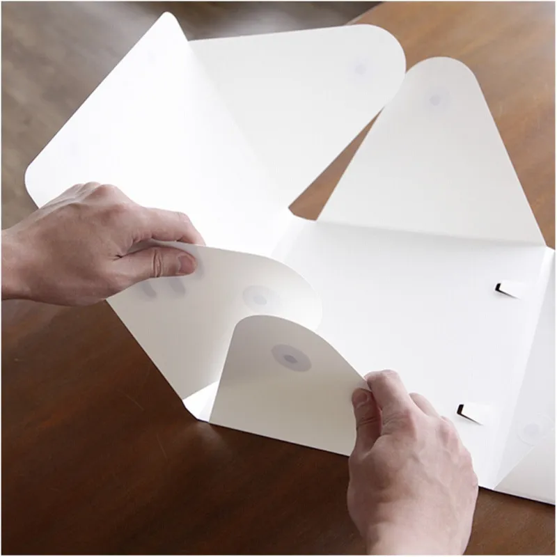 When folded, the Foldio1 has a thickness of only 2.5 cm, making it easy to carry. The soft handle ensures optimal comfort. Thanks to the use of many built-in magnets, the Foldio1 can be folded in and out in just five seconds.