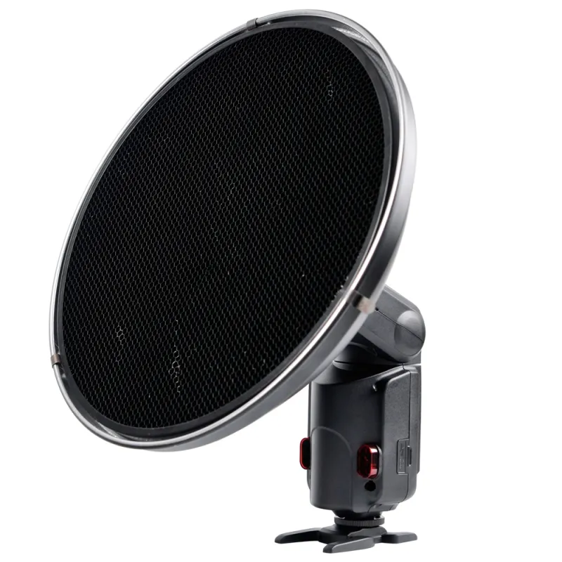 The Godox Witstro Beautydish with grid is specially designed for use with the Godox Witstro AD180 or AD360 flash. The whole consists of two parts: a reflector and a grid. The reflector focuses the light towards a central point, making the light a combination of a direct flash and a softbox. Thanks to the grid, the light is even more focused and provides a high contrast. The beauty dish can also be used without the grid.