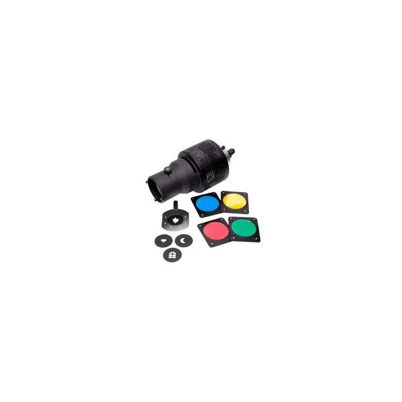 It contains changeable colour foils in blue, red, yellow and green as well as projection patterns (gobos) in the form of a heart, window, moon and leaf. Therewith you can bring a lot of variety and interesting lightings in your background, e.g. for portraits and full-length portraits. In product photography, the various projection possibilities also result in outstanding priorities and thus in special pictures.