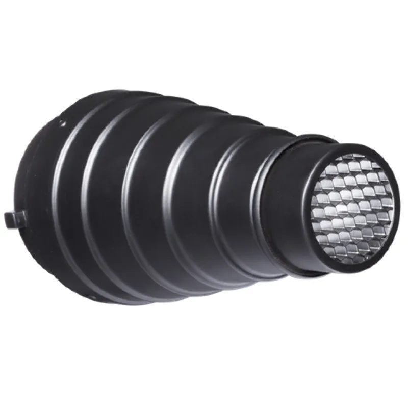 The SK-CS22 from StudioKing is often one of the first purchased accessories for all types of photography. The conical snoot concentrates the light into a fairly soft beam, ideal for backlighting or fill light. The snoot comes with a honeycomb and color filters, but can also be used without these accessories. The snoot is equipped with a Linkstar S-Bayonet, suitable for the LL, LL-D, LF and FS series. The bayonet is not interchangeable. The S bayonet is also suitable for the brands Bowens, StudioKing, Lastolite, Jinbei, Qihe and Aurora. The diameter of the front opening is 6.2 cm.
