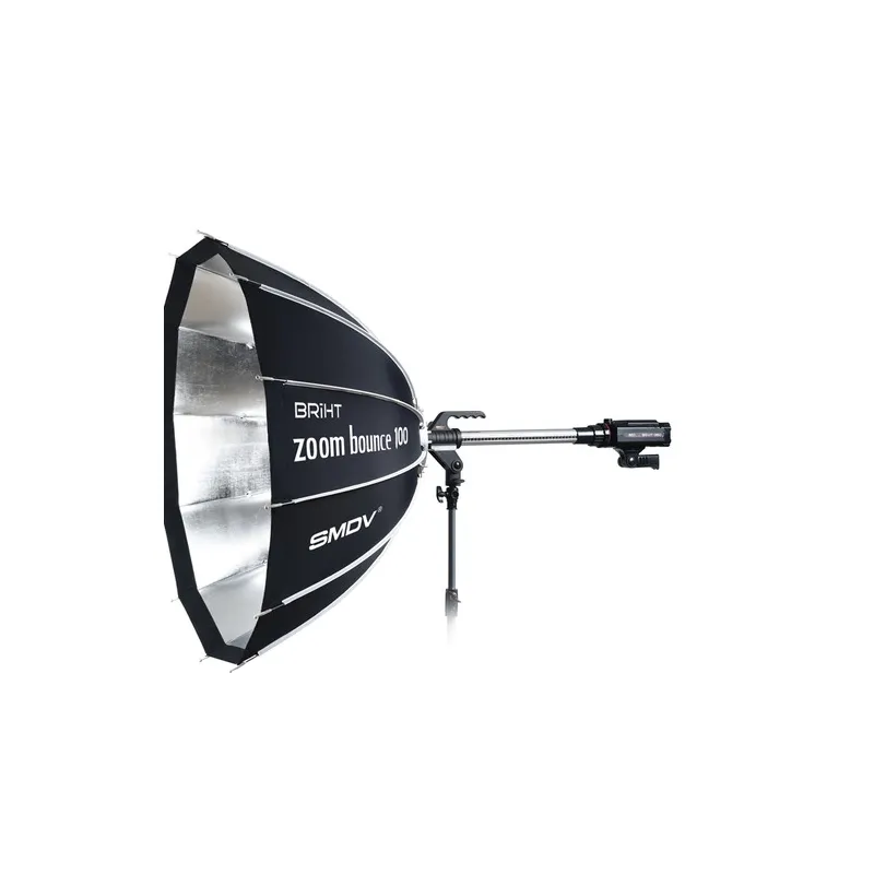 The bounce-arm mounts between the Briht-360 studio flash and the original flash tube. The included reflective disc, that you place on the flash tube, is provided with a built-in LED-modeling light. Additionally, you can use the bounce-arm with the SMDV Alpha Speedbox until 110 cm.