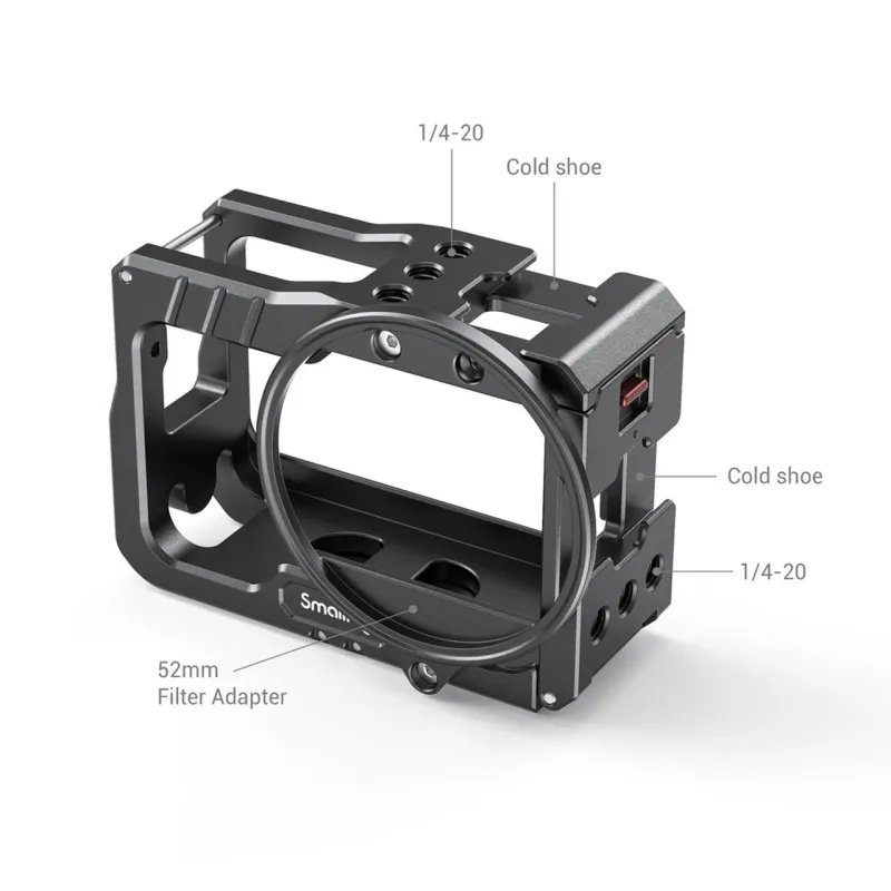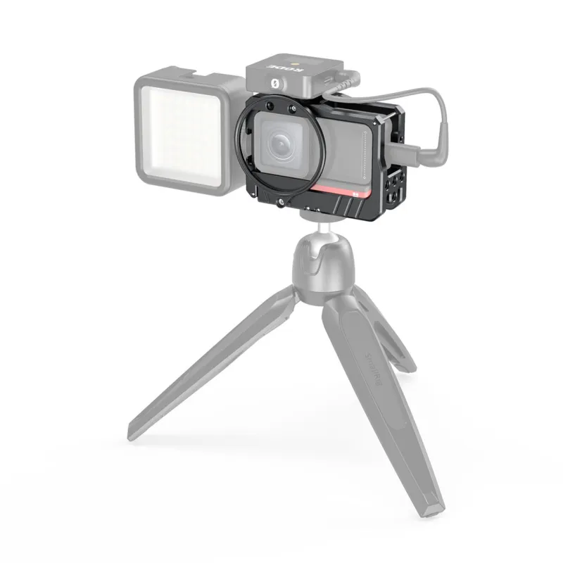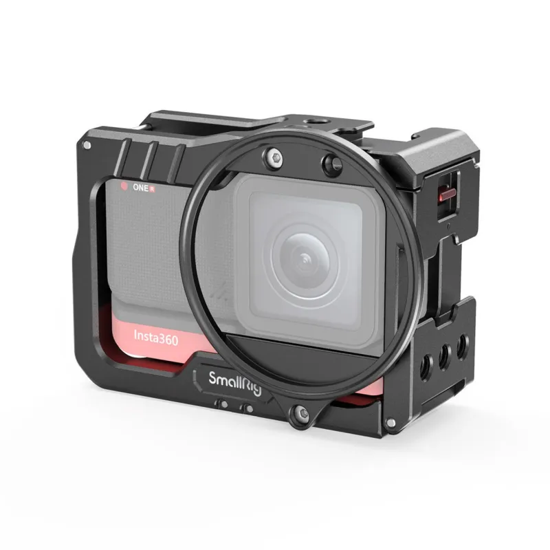 SmallRig Vlogging Cage and 52mm Filter Adapter for Insta360 ONE R 4K Edition 2901 is a form-fitting aluminum cage that protects the camera while providing a plenty of accessory mounts, without interfering with the camera's button or port. Simply slide the camera into the cage from the side, and press the cover to lock it in place. The cage features two cold shoes and several 1/4”-20 threaded holes for accessory mounting, like a microphone or a small LED light. The folding fingers on the bottom let you to attach the camera on a variety of GoPro-type mounts and surfaces; while the 1/4”-20 mount at the center on the bottom makes it possible to attach the camera on a 1/4”-20 tripod. The cage features a filter ring that accepts filters with a 52mm thread, which can be attached both on the front and back of the cage.