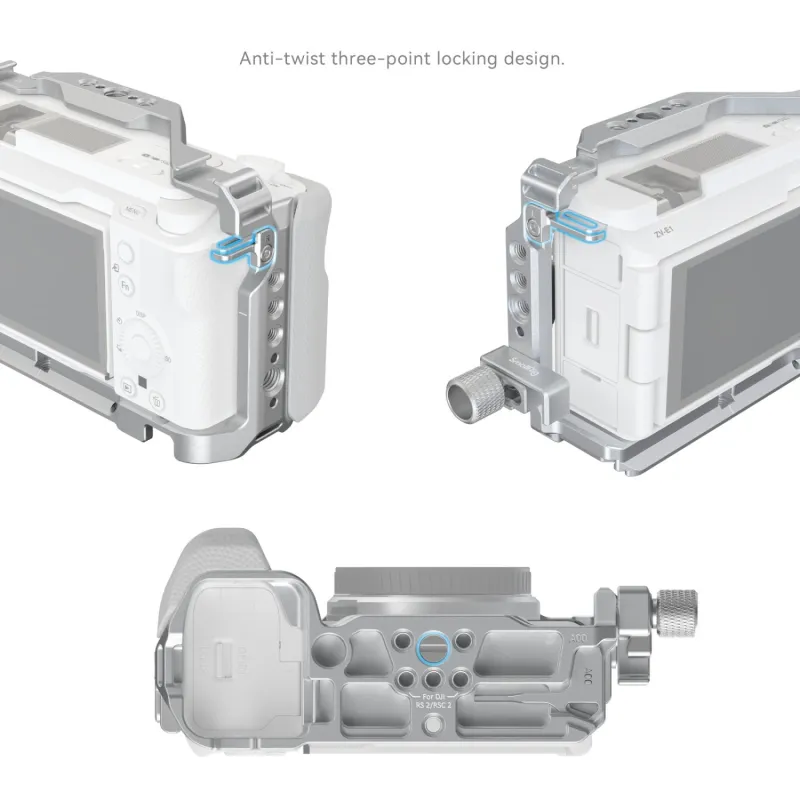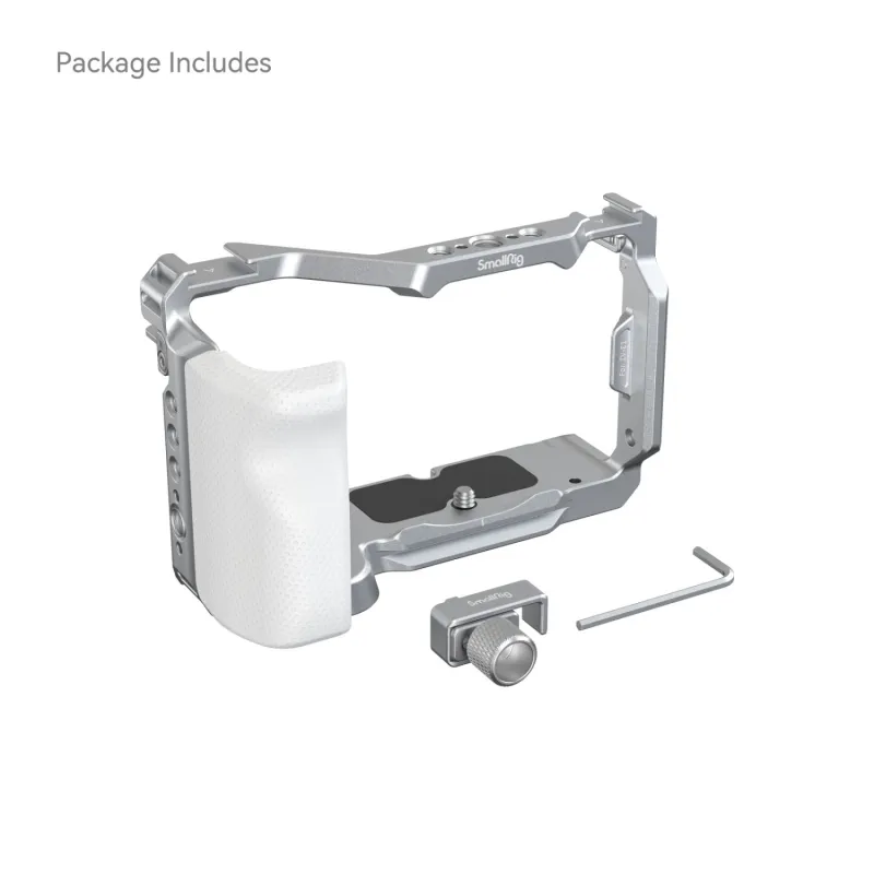 SmallRig Cage Kit for Sony ZV-E1(Limited Edition) 4320 is designed to attach accessories and protect the camera and HDMI port. It includes a cage with a silicone handle and an HDMI cable clamp. The cage secures the camera via one 1/4"-20 screw on the bottom and one side lock adapter on both sides, with an ergonomic silicon handle offering a comfortable grip. The HDMI cable clamp attaches to the left side of ZV-E1 using a 1/4"-20 thumb screw and two anti-twist pins to protect the HDMI port and ensure stable transmission.