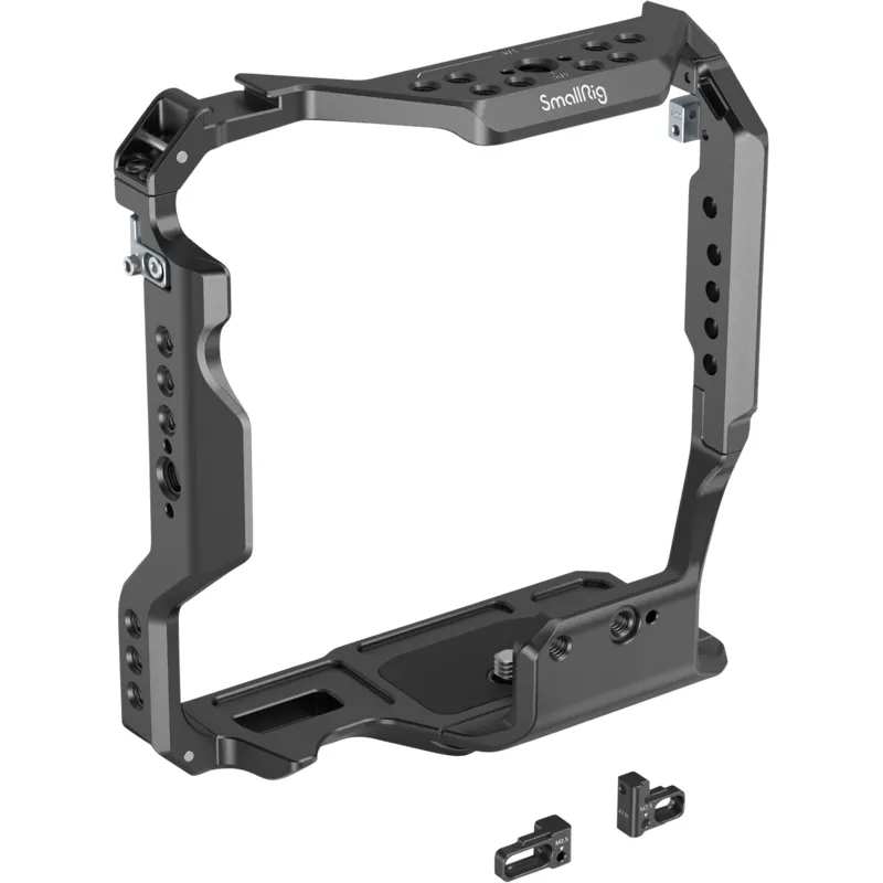 SmallRig Cage for Sony Alpha 7S III/Alpha 7 IV/Alpha 7R IV/Alpha 1 with VG-C4EM Battery Grip 3594 is designed to protect the camera and provide accessory mounts. Secured by one 1/4''-20 screw at the bottom and two side lock adapters via the shoulder strap holes on each side. The cage maintains access to buttons, card slots, battery door, and flip screen. Featuring 1/4''-20 threaded holes and ARRI 3/8" -16 locating holes to attach Top Handle 1638 and 2165 for a low-angle shot, Monitor Mount 2904 and 2903 as well as Side Handle 2093. Cold shoe mount on the top supports microphones or LED lights, and NATO rail on the left fits NATO Handle 2427 and 3260. Two 1/4''-20 threaded holes on the front bottom support Rod Clamp 1943 for matte box, follow focus, lens support, etc., one of the front threaded hole features a small locating hole suits Rod Clamp 3276 for follow focus. Arca quick release plate enables quick switch between tripod and handheld shot; the bottom 1/4''-20 threaded holes allow for mounting DJI RS 2/RSC 2 Quick Release Plate (Upper) with 2 screws for greater stability. Optional Cable Clamp 3000 is separately available for Sony A7 IV and A7S III to protect cable port and prevent signal disconnection. The cage features multiple rubber pads inside to prevent scratches and comes with a magnetic spanner for easy disassembly and assembly. The package contains four side lock adapters, the black ones for Sony A7 IV and silver gray ones for Sony A7S III, A7R IV, and A1.