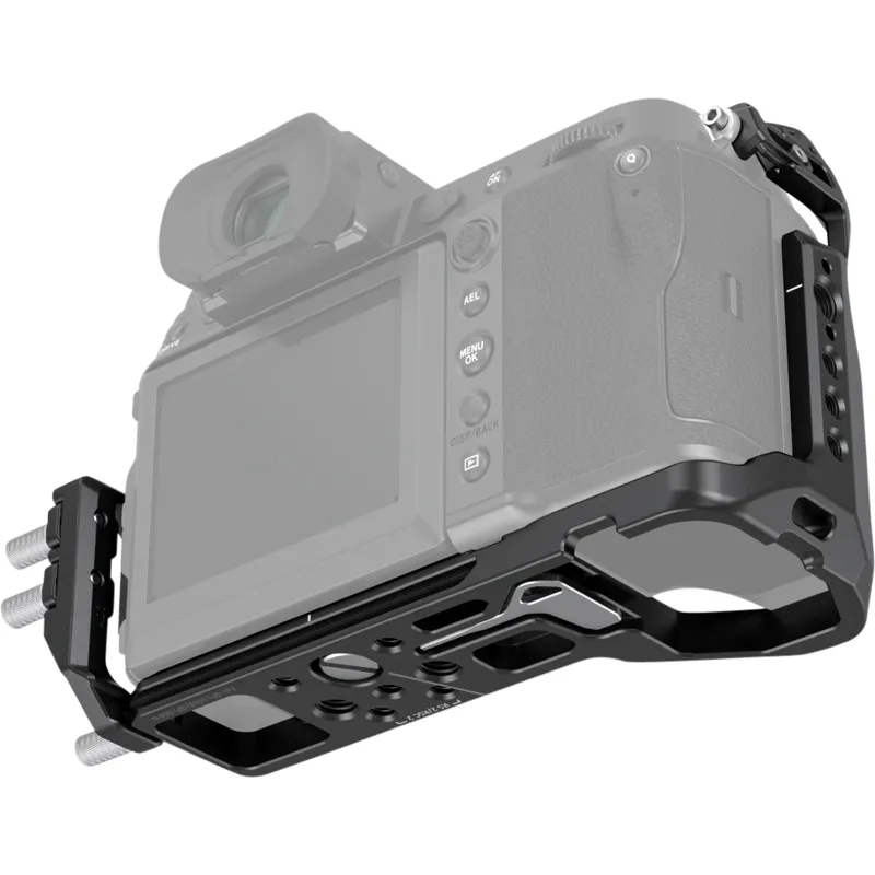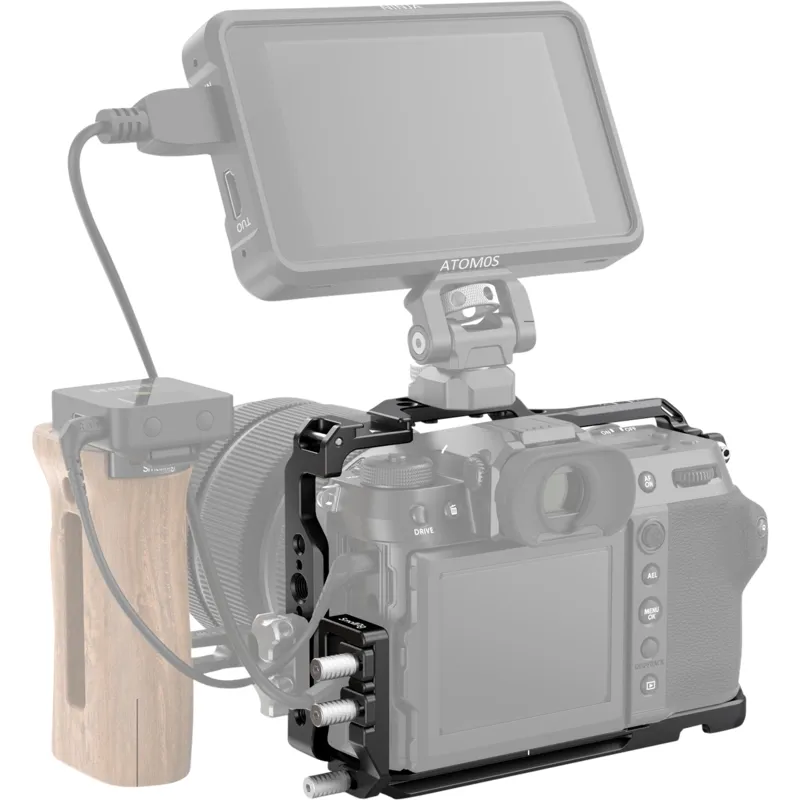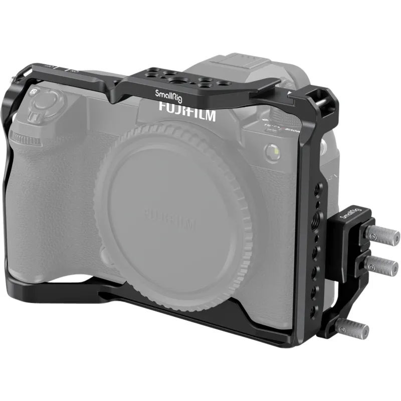 SmallRig Cage & Cable Clamp for FUJIFILM GFX100S/GFX50S II 3715 is designed to protect camera, provide various accessory mounting points, and ensure stable signal transmission. Securing camera via one 1/4"-20 screw at the bottom and the right shoulder strap hole to prevent deflection. The cage maintains access to buttons, card slots, ports, battery door, and tilt-type screen. It features 1/4"-20 holes, ARRI 3/8" -16 locating holes, NATO rail to mount Top Handle 2165, Side Handle 2093, HSS2426, 2187, as well as Monitor Mount 2903 and 2904; comes with a cold shoe on the top to attach microphone, LED light, flash trigger, etc. The Arca-Swiss quick release plate fits tripod 3257 for quick switch between tripod and handheld shooting; 1/4"-20 threaded hole at the bottom suits DJI RS 2/RSC 2 stabilizer quick-release plate (pad) of DJI RS 2/RSC 2 stabilizers for stabilizer shooting. An accessible spanner is included for screw assembly or disassembly. In addition, the cage comes with an HDMI & Type-C cable clamp, fixed by a knob screw, to prevent signal disconnection.