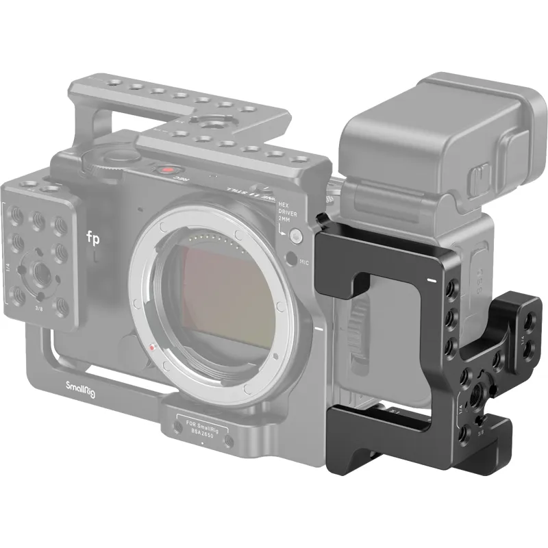 The cage shall work with SmallRig SIGMA fp camera cage 3211, to which it secures via a 1/4”-20 screw on the bottom and an M2.5 screw on the front.