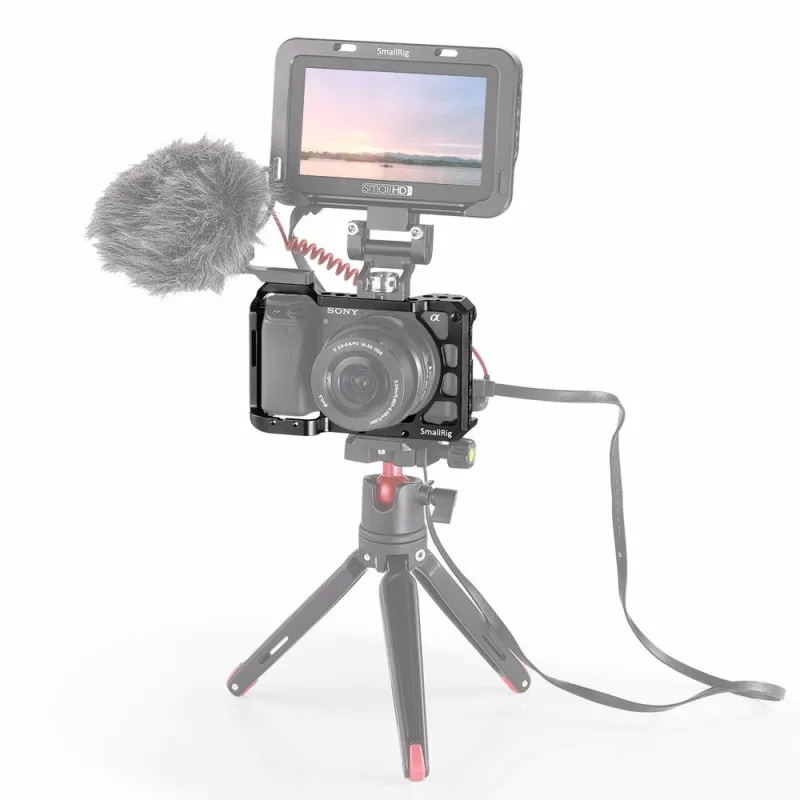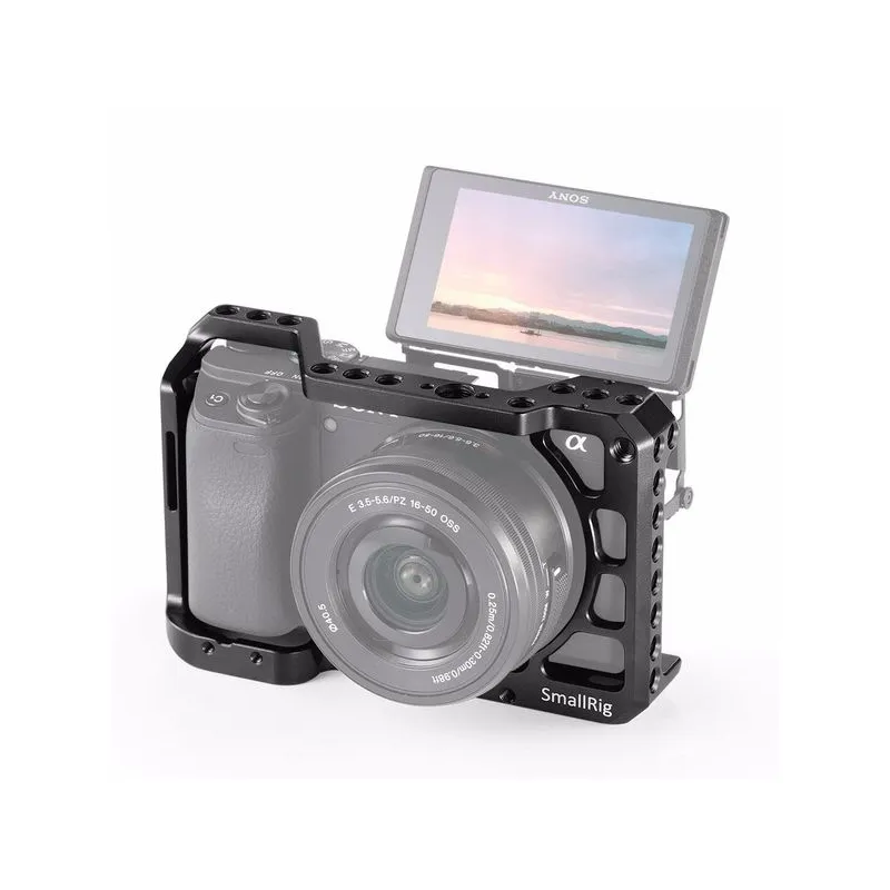SmallRig Cage for Sony A6100/A6300/A6400/A6500 CCS2310. Cage is designed to provide protection and mounting threads for accessories such as monitor, microphone and light. The cage secures to the bottom of camera and features a m2.5 threads as a second lock point on the right side to prevent the camera from twisting.